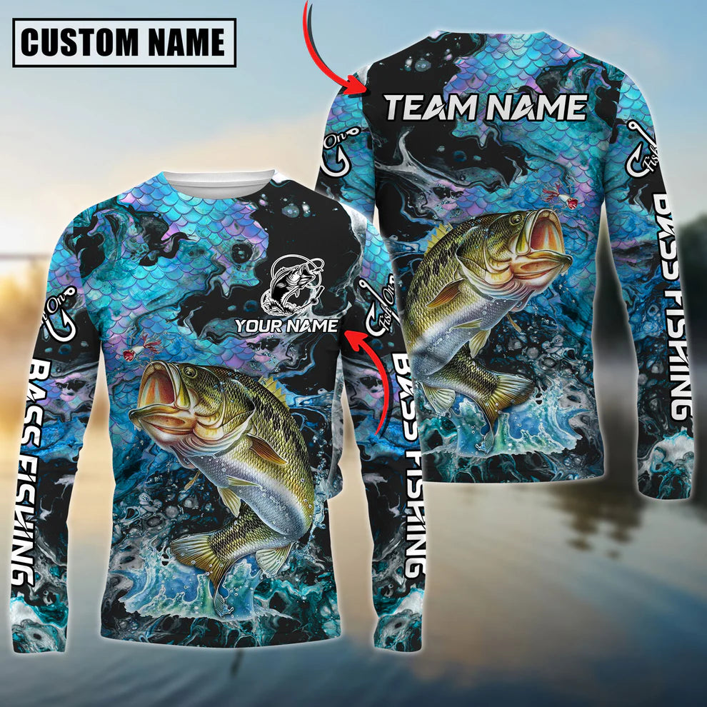 Cowgic Personalized Text Bass Fishing Blue Fishing SkinPattern 3D Long Sleeve Shirt