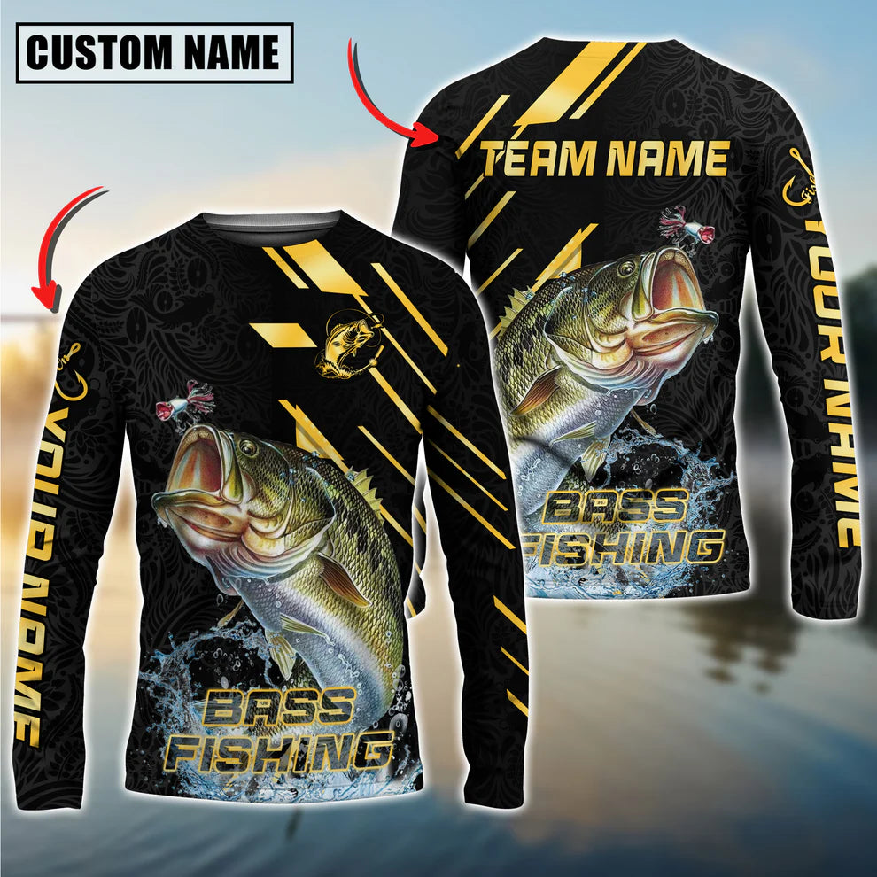 Cowgic Personalized Text Bass Fishing Gold Black Pattern 3D Long Sleeve Shirt