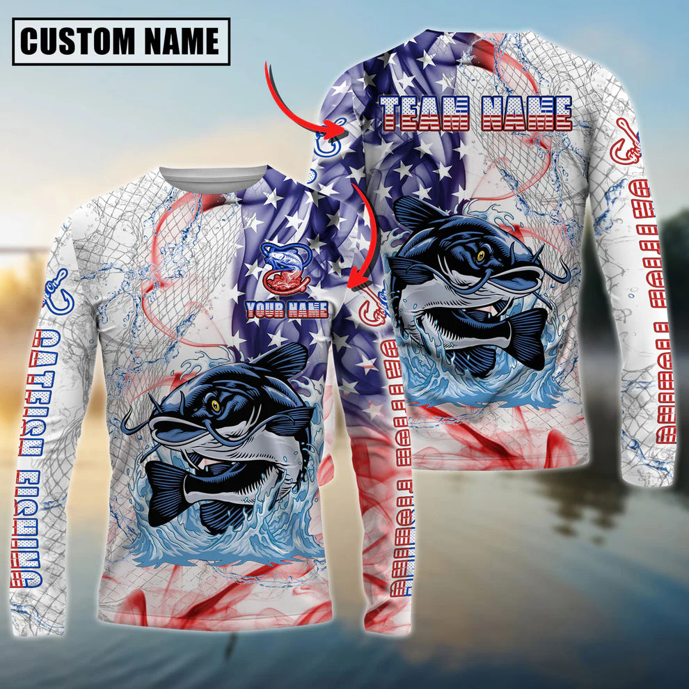 Cowgic Personalized Text Catfish Fishing US Flag Pattern 3D Long Sleeve Shirt