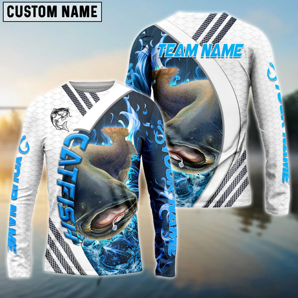 Cowgic Personalized Text Catfish Fishing White Blue Lava Sport Pattern 3D Long Sleeve Shirt